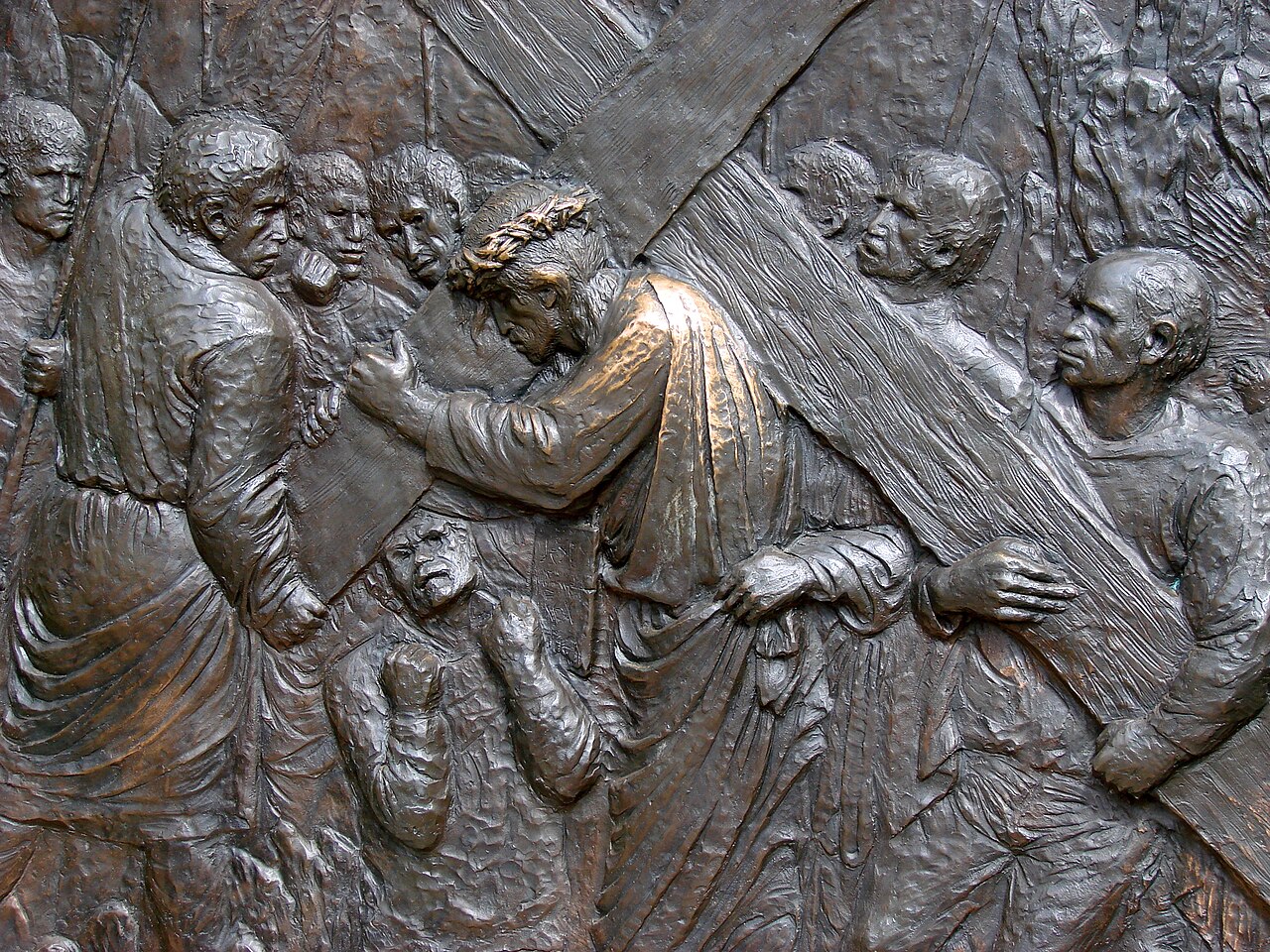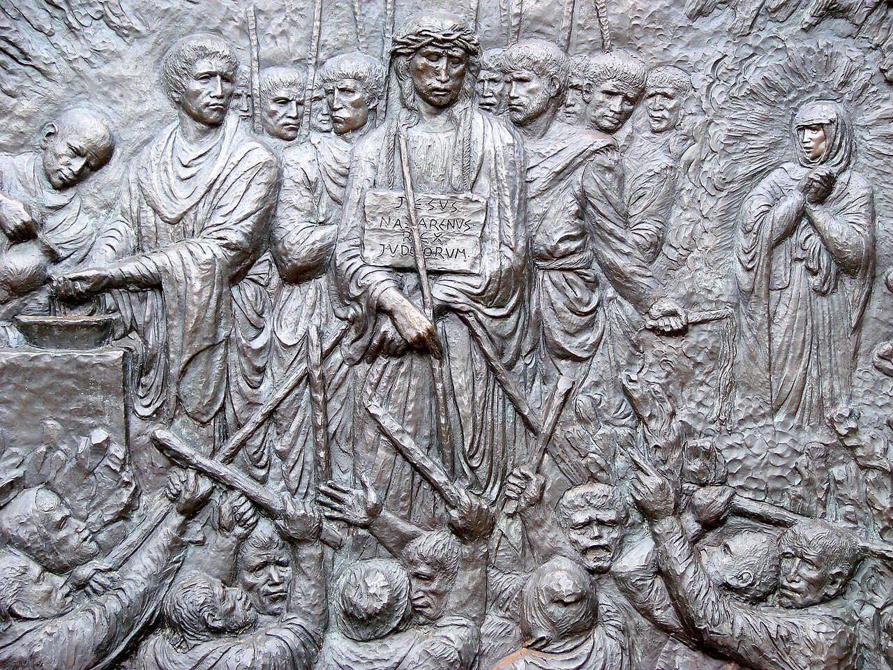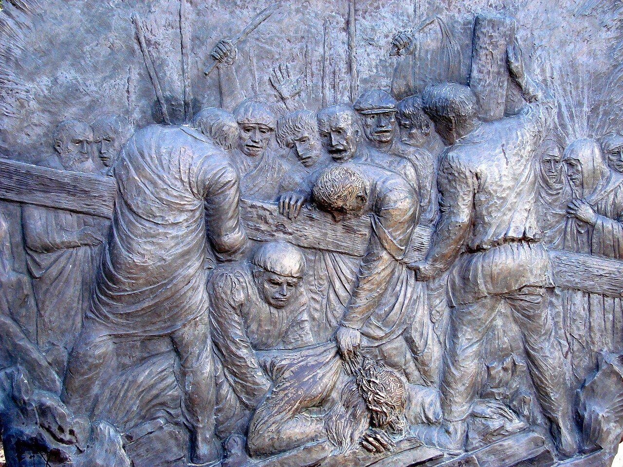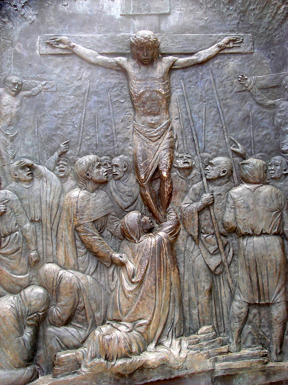 Italian artist Federico Severino (b. 1953) was commissioned in 2009 to create a series of 14 bronze bas-reliefs depicting the Stations of the Cross to commemorate the 1,400th anniversary of the Pantheon’s dedication as a Christian church. One set of these sculptures was installed in the Rotunda of the Pantheon in Rome in 2010. The second set was acquired by Saint Michael and All Angels Episcopal Church in Dallas, Texas, where it was installed in 2018. Severino’s work is noted for its expressive and emotive style, capturing the profound moments of Christ’s Passion.